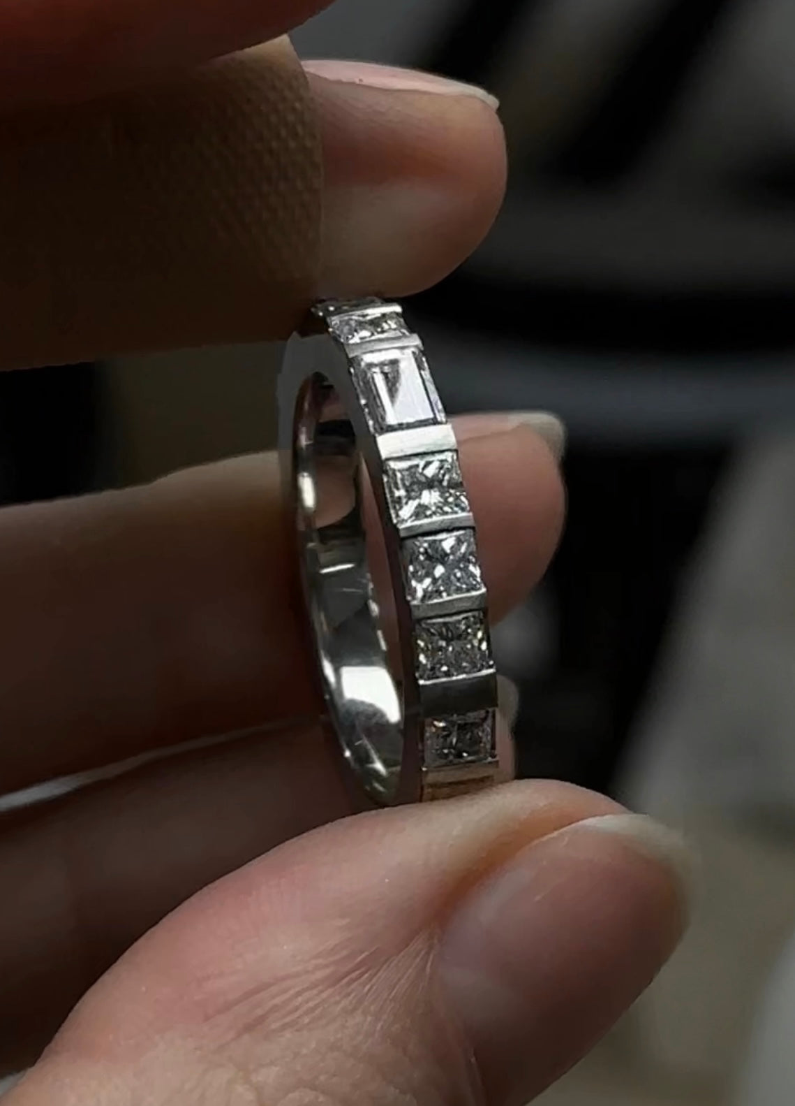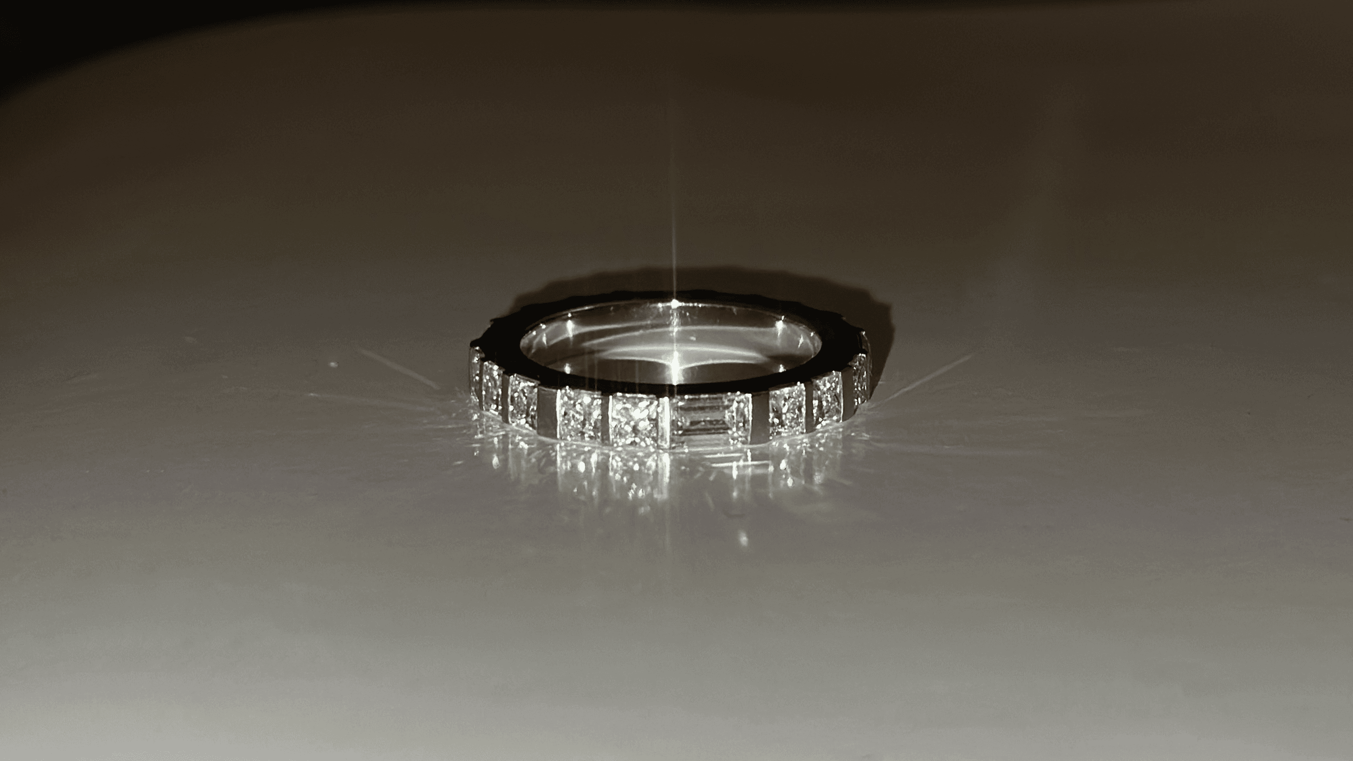 A contemporary take on the full-set diamond band, featuring an irregular stone placement design encircling the shank. This offbeat arrangement lends a laid-back sophistication, blending ease with elegance. Whether styled solo or paired with other bands, it remains a show-stopping accent to your everyday attire.